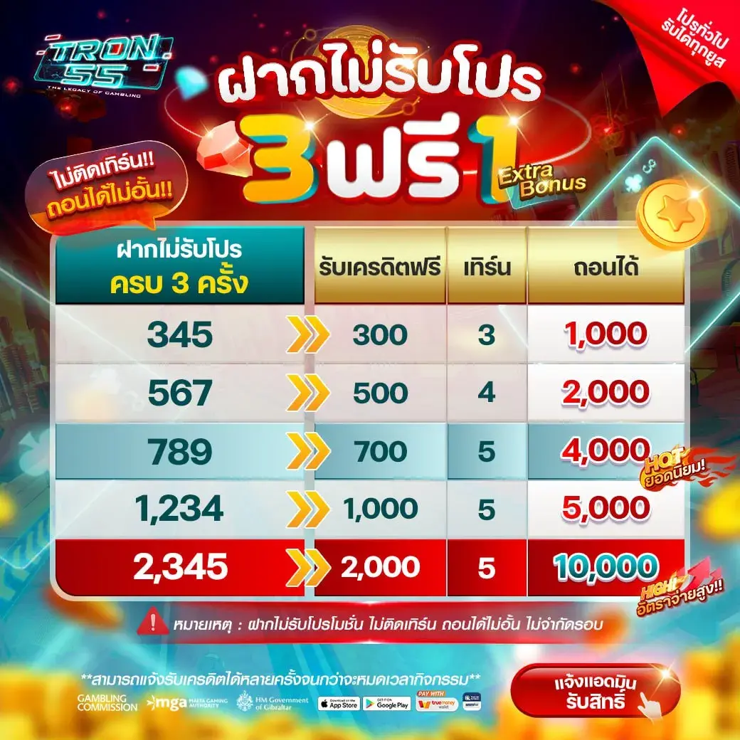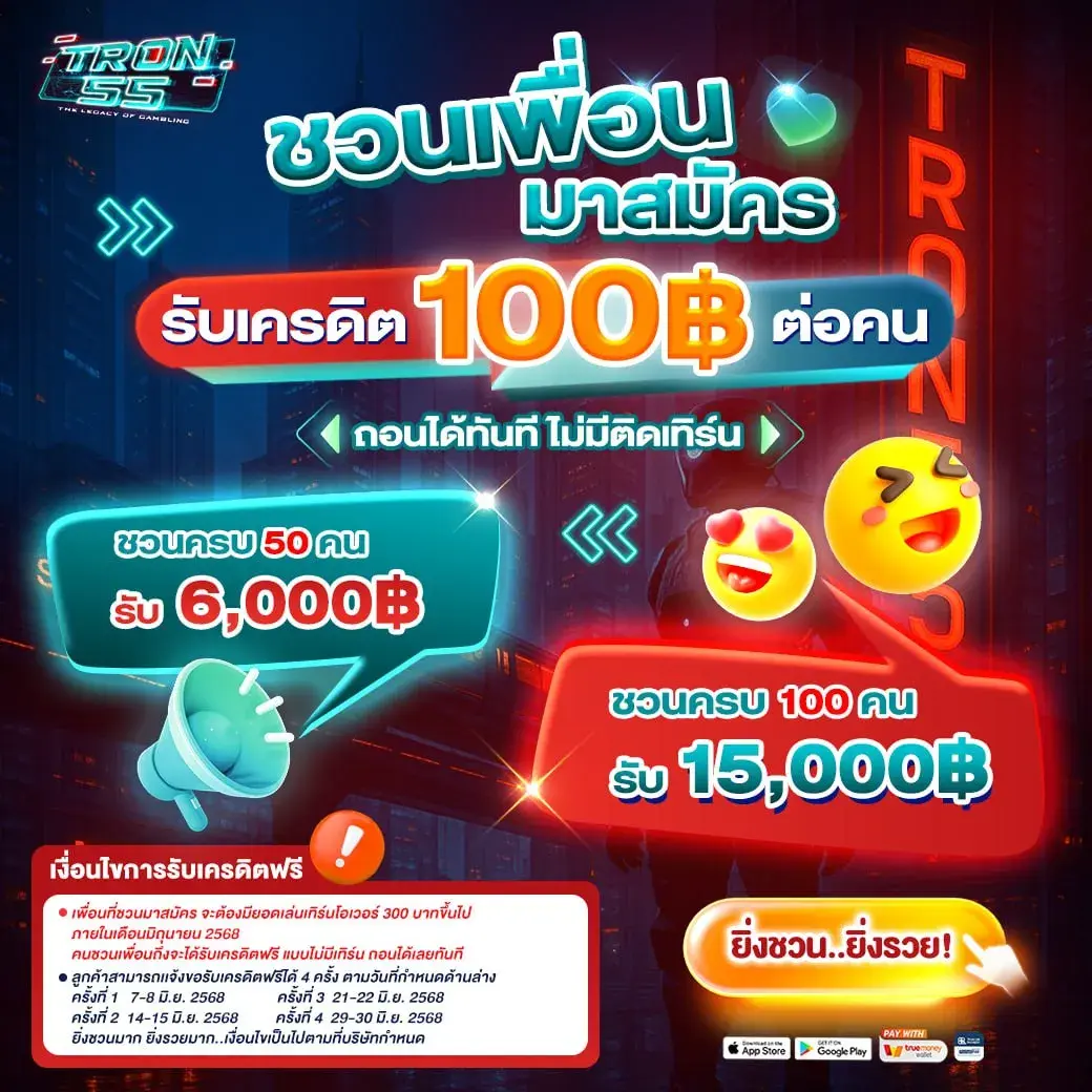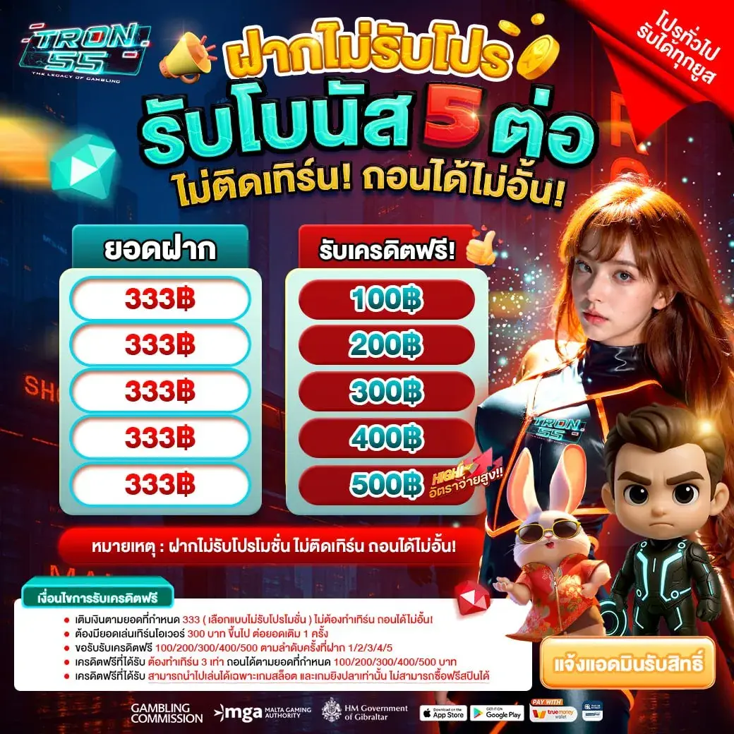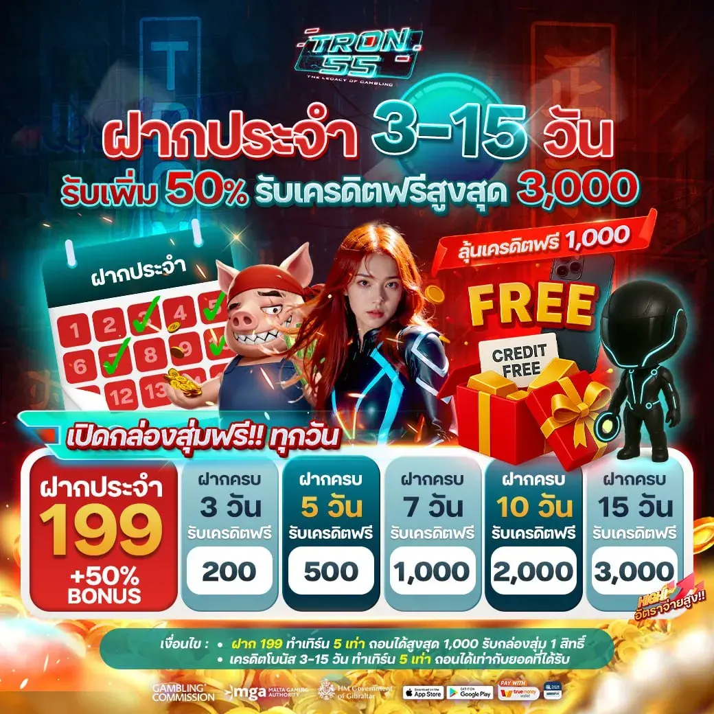โปรโมชั่นสำหรับสมาชิกใหม่ของ Tron55 ได้แก่ โบนัสต้อนรับที่มอบเครดิตฟรีทันทีหลังจากการสมัคร และโปรโมชั่นรายวันที่ให้โบนัสเพิ่มเติมจากยอดฝากสำหรับสมาชิกเก่า